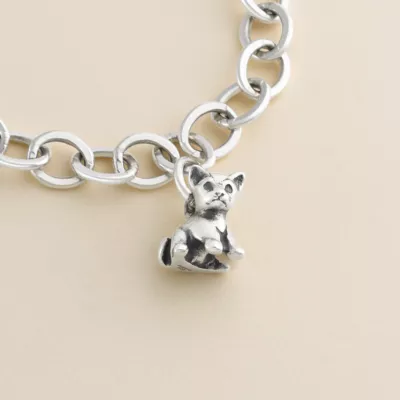 Made for feline fans, this sterling silver kitten charm is a playful addition to any bracelet. It makes a great starter charm due to its tiny size.