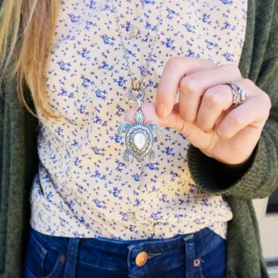 Sea turtles are treasured around the world for their gentle mystique. With Oceanic art-inspired detail and a pear-shaped gemstone, in Mother of Pearl or Turquoise, set in a bronze bezel, this sterling silver statement piece goes swimmingly on a chain or neck collar. Please note, subtle color and shade differences may occur with this gemstone.